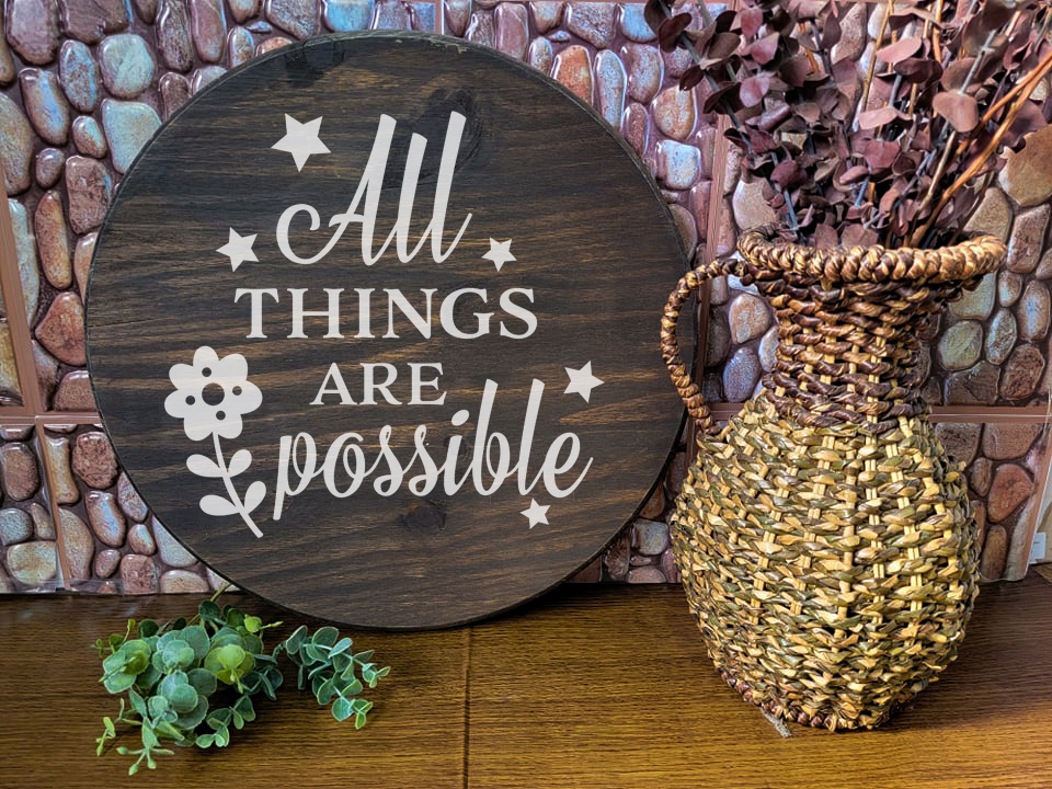 Come and join our event as we create this fun round sign. Upgrade the size or to a lazy Susan, round tray, or both! You can also make this a door hanger and hang it on your front door for all your neighbors to see. This basic sign is approximately 15 inches wide in diameter, and less than 1/2 and inch thick and can be customized with any stain and paint color you would like.