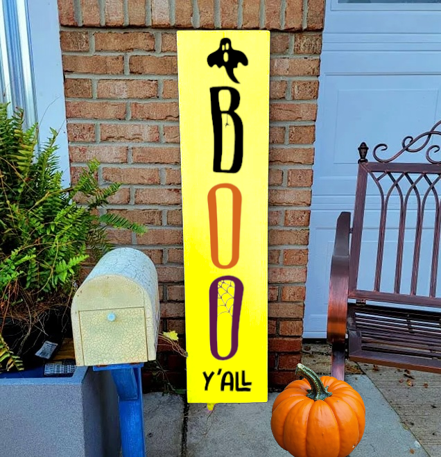 Come with us to create this boo y’all porch sign! This sign is 12 inches wide by 48 inches long and can be customized with any stain and color you would like to appear on the sign. This item will take approximately 3-4 hours to create!