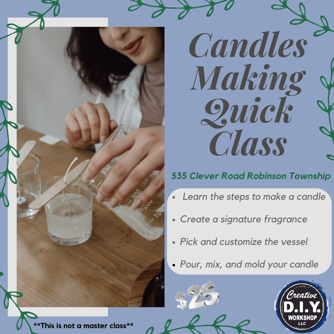Join us for an enchanting Candle Making DIY Workshop where you’ll learn the art of crafting your own personalized candles! Dive into a world of scents, colors, and creativity as you design and create unique candles to illuminate your space.
