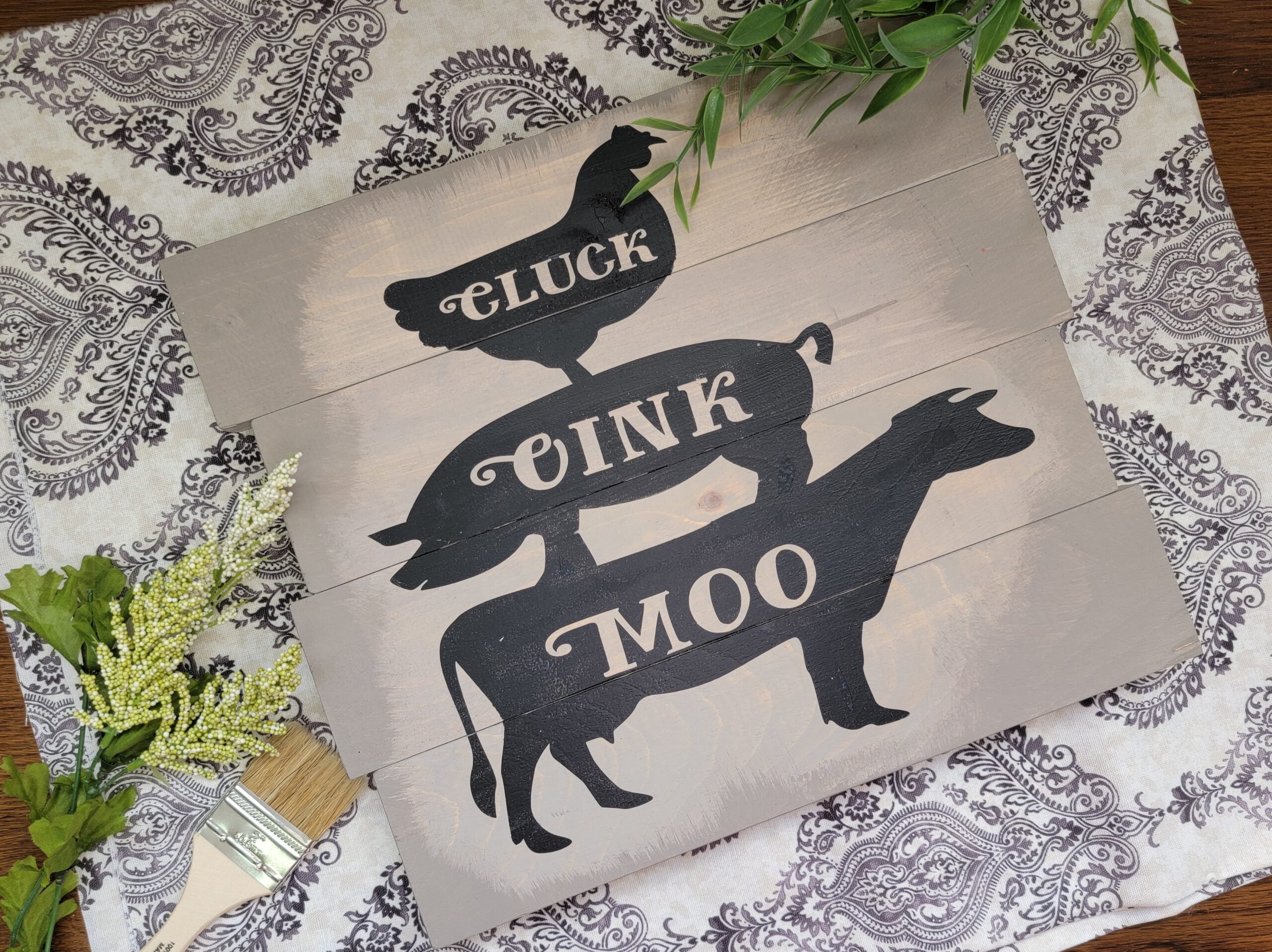 Cluck Oink Moo 16×16 Planked Sign