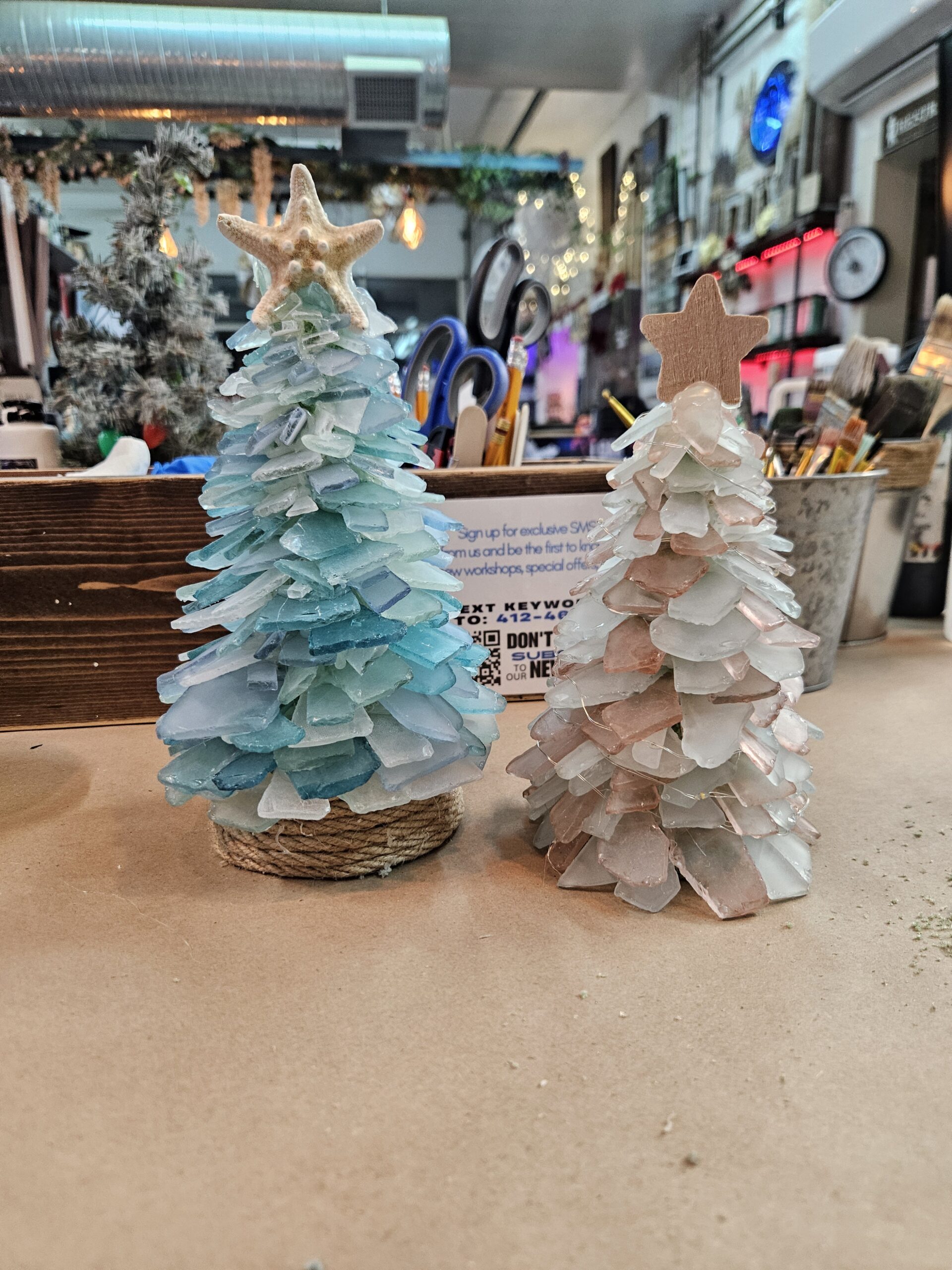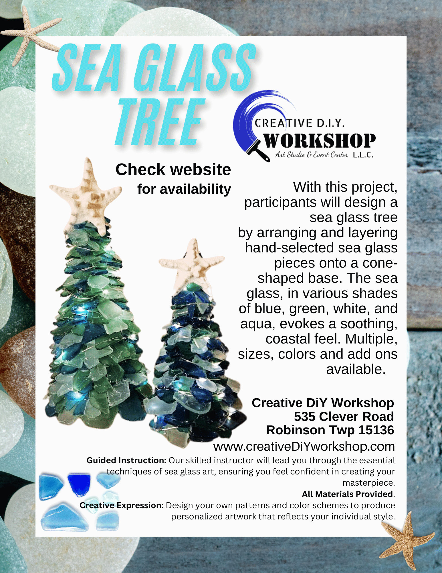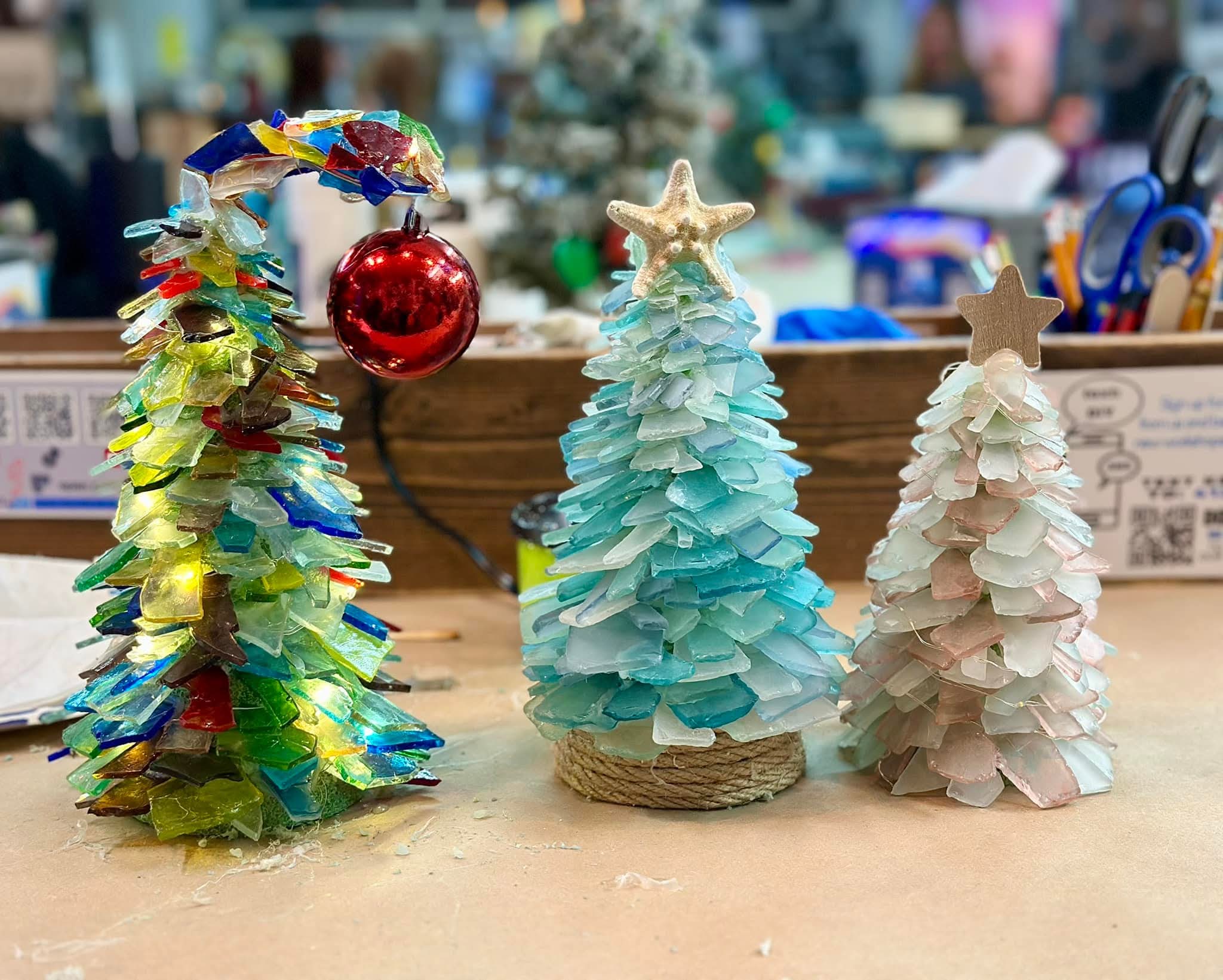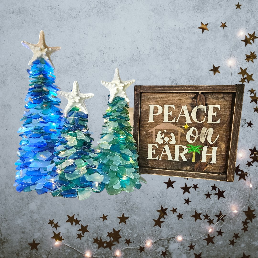 In this class, participants will design their own stunning sea glass tree by arranging and layering hand-selected sea glass pieces onto a cone-shaped base. The sea glass, available in various shades of blue, green, white, and aqua, captures the soothing essence of the coast, creating a beautiful and serene aesthetic.