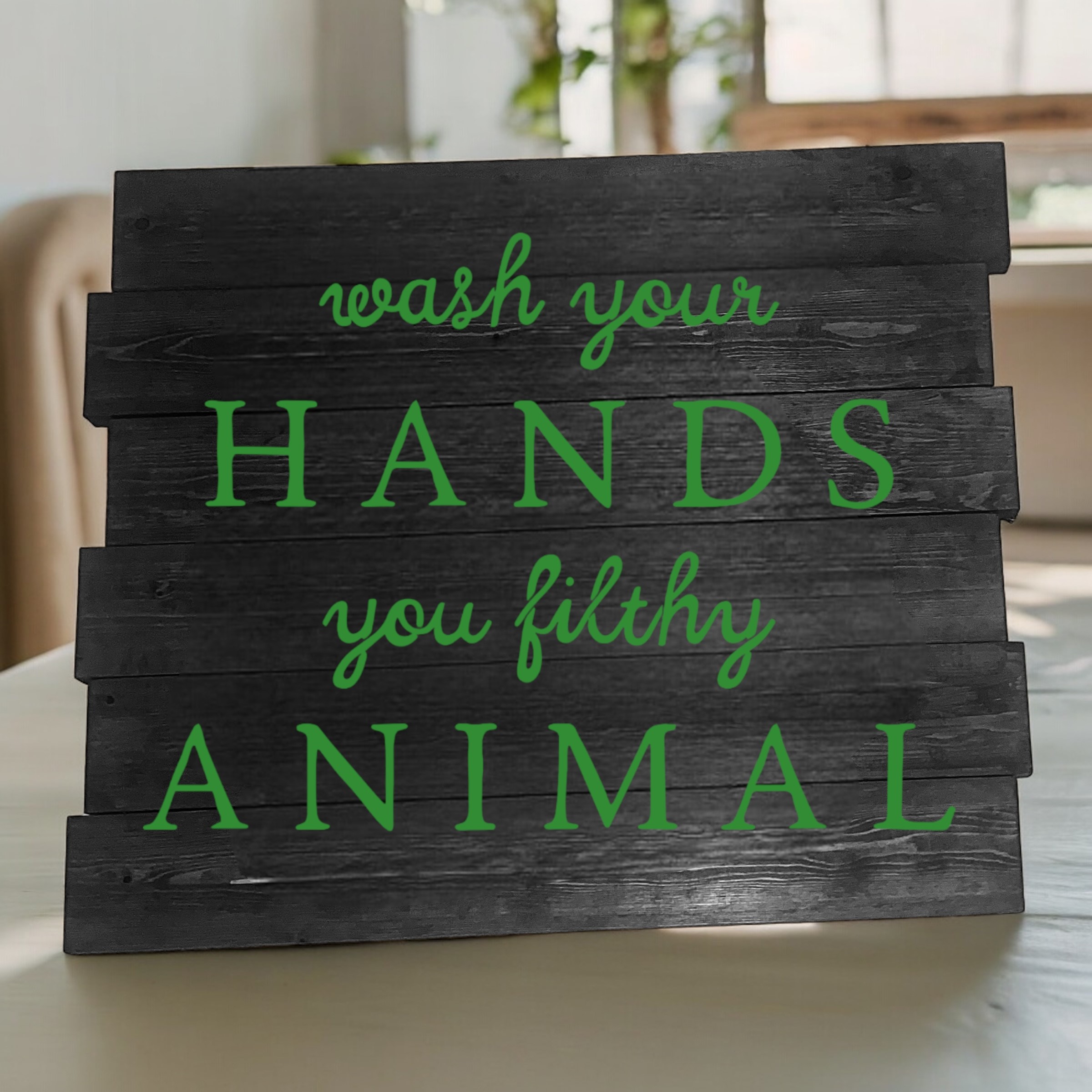 Come and join our event as we create the Wash Your Hands you Filthy Animal planked sign. This sign is 16 inches wide by 16 inches tall and can be customized with any stain and color you would like to appear on the sign. This item will take approximately three or four hours to create!