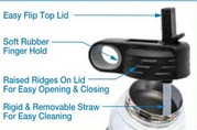 Stainless steel double wall vacuum insulation for maximum heat and cold retention. Easy flip lid, soft rubber finger hold, raised ridges on lid for easy opening and closing, rigid and removable straw for easy cleaning.